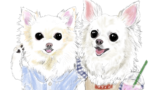 戦隊スーツであるもんぺを履いて戦う5にんのチワワのかっこいいポーズをデザインにしたいと思って、絵を描いてみたよ。