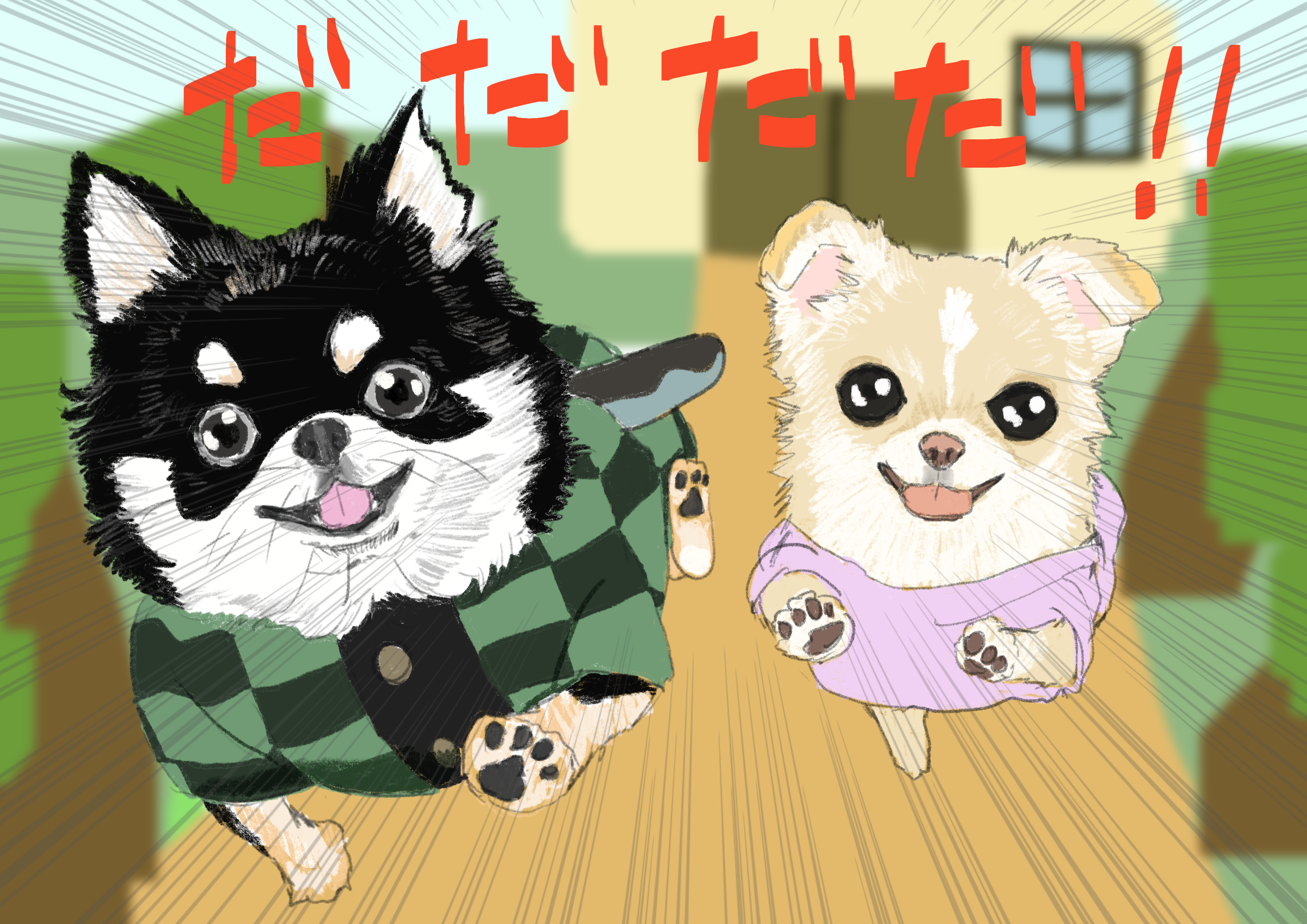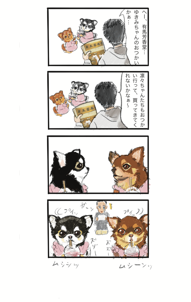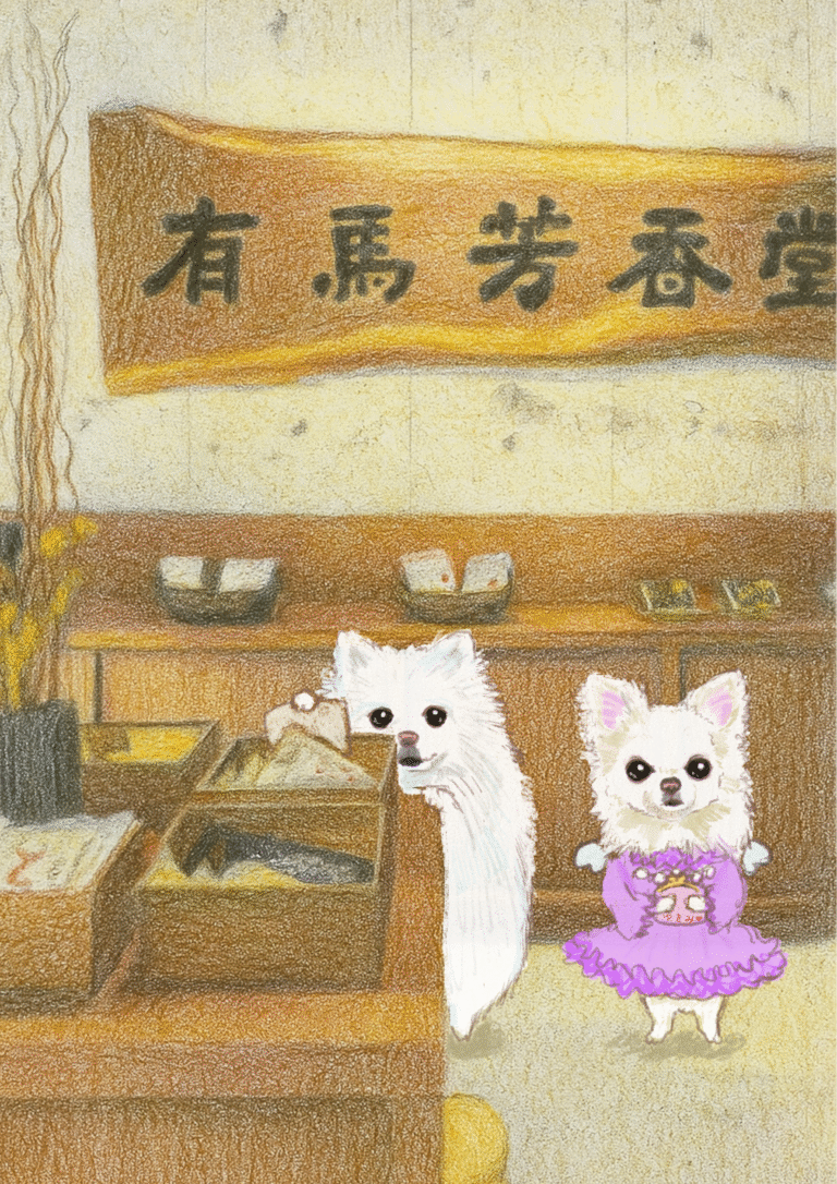 ゆきみちゃんが有馬芳香堂さんにはじめてのおつかいに行って買ってきてくれたのかな?そうなら、きっと仲良しのミンキーちゃんも付き添いで行ってくれたのかな?なんて想像してイラスト描きました。