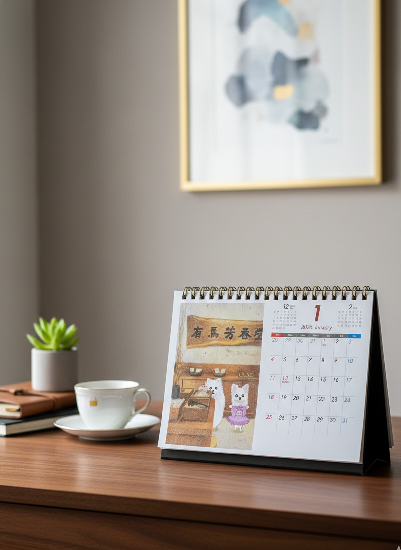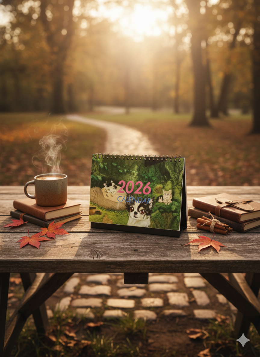 そんな時に見つけたのが、「縦のイラストの横に日付を入れられる」デザインの卓上カレンダー印刷。 これなら大好きなチワワのイラストも、カレンダーとしての使いやすさも両立できる!と確信し、お試しで10冊だけ形にしてみました 。